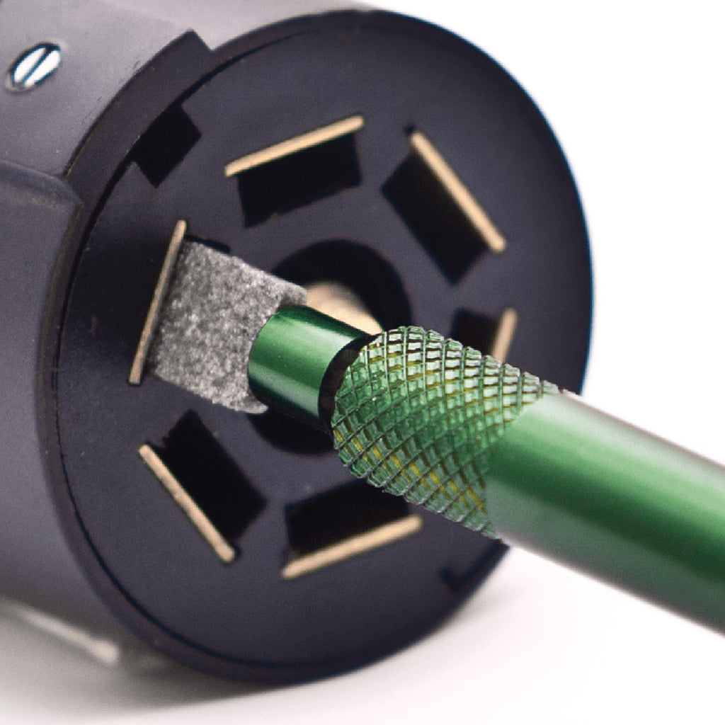 The included tester will verify tow vehicle is sending proper signal to the connector, while the cleaning tools remove corrosion and verify proper pin size on both male and female truck/trailer plugs. For use with 7-way flat (spade) connectors.