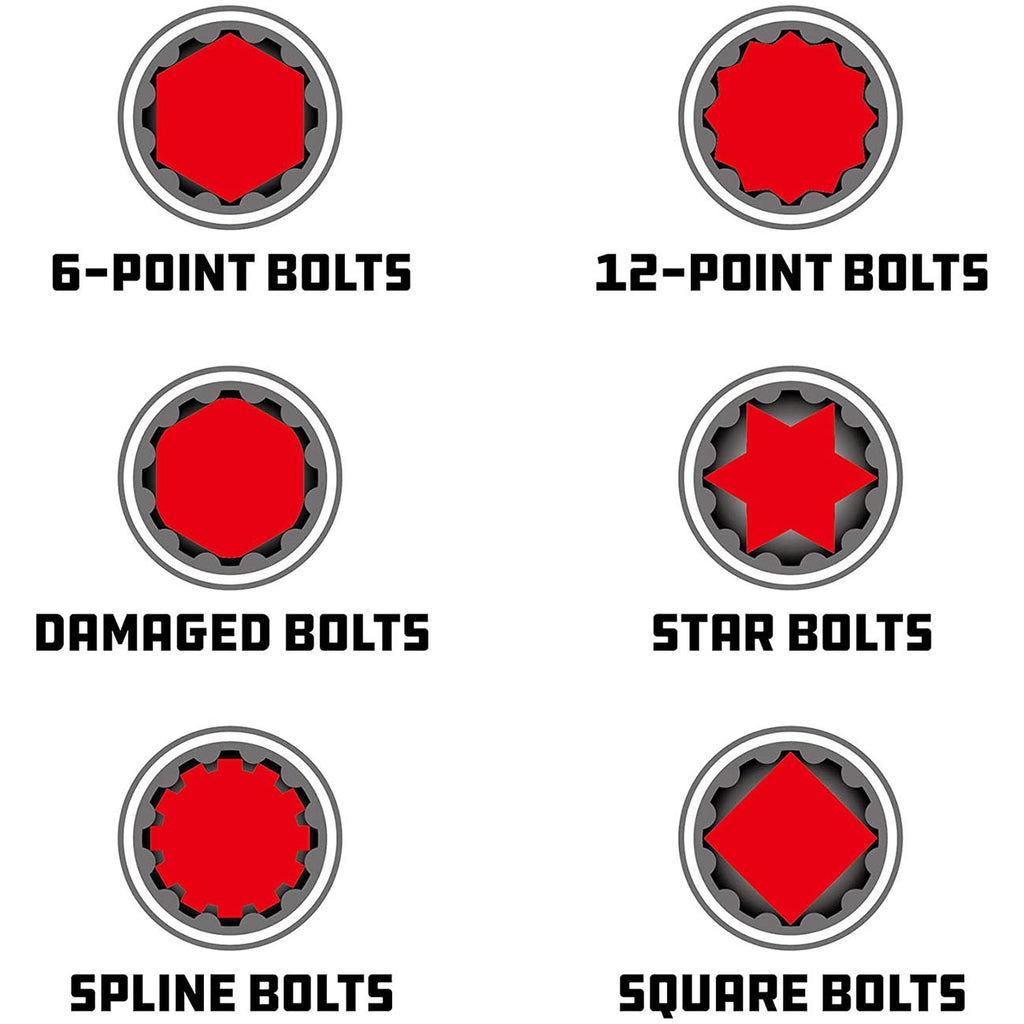 Works on a variety of bolts, including SAE and metric 6, 8 and 12 point hex, e-torx, square, splined and damaged heads