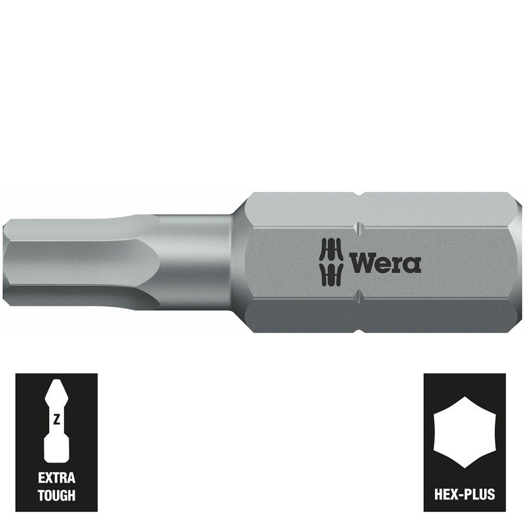 Tough Wera bits for hexagonal socket screws, for universal use. Hex-Plus offers lager contact surfaces in the screw head. The notch effect is reduced to a minimum and the destruction of the screw is nearly eliminated. 1/4"e; hexagonal, suitable for holders as per DIN ISO 1173-D 6.3.