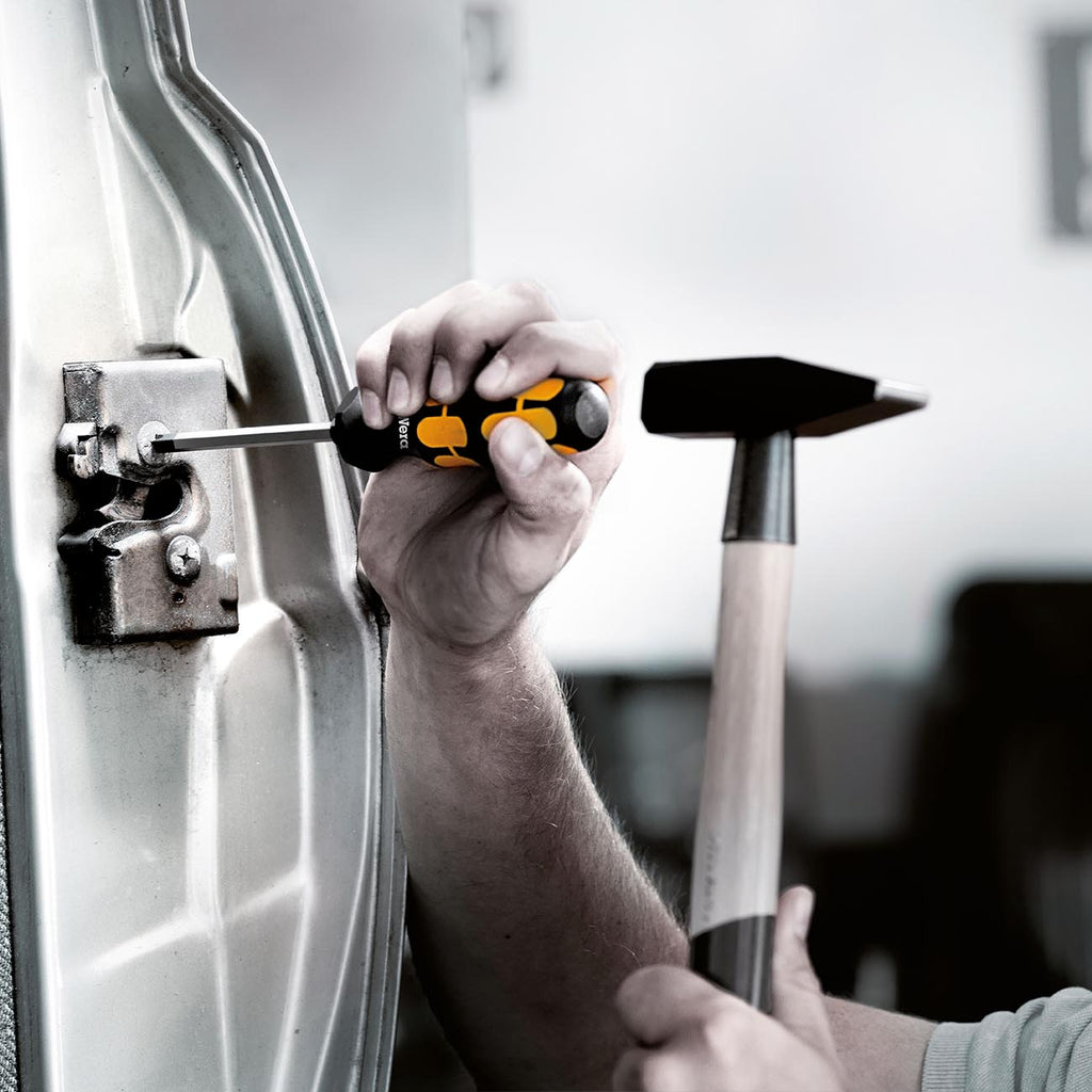 6-piece Wera chiseldriver set for screwdriving, chiselling, mortising and slackening stuck screws. With a multi-component Kraftform handle for fast and gentle work. Kraftform Plus: Hard handle zones for high working speeds, while soft handle zones guarantee high torque transfer. With pound-thru hexagon blade made of premium bit material, thereby giving lossless power transmission even with hammer blows. Tough tempered material to prevent the blade from chipping or breaking. With integrated impact cap to increase service life and reduce risk of splintering. The Wera Black Point tip and a sophisticated hardening process garantee a long usability of the tip, increased corrosion protection and exact fitting accuracy. With hexagon anti-roll protection to avoid bits from annoying rolling away in the workplace.