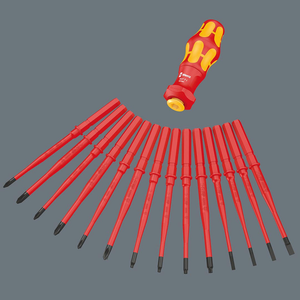 Rated for up to 1,000 Volts! High quality Kraftform Plus VDE Insulated screwdriver set out of stainless steel by Wera. The stainless tools from Wera are vacuum ice-hardened and have the hardness and strength needed for screw connections. They can be used for industrial application without hesitation. The individual testing of the Kraftform Stainless VDE Insulated screwdrivers in a water bath at 10,000 volts as per DIN EN 60900 (IEC 60900) ensures safe working with voltages of up to 1,000 volts. Multi-component Kraftform handle for fast and low-fatigue working. “Take it easy” Tool Finder: color coding according to profile and size. The hexagonal anti-roll feature prevents any bothersome rolling away at the workplace.