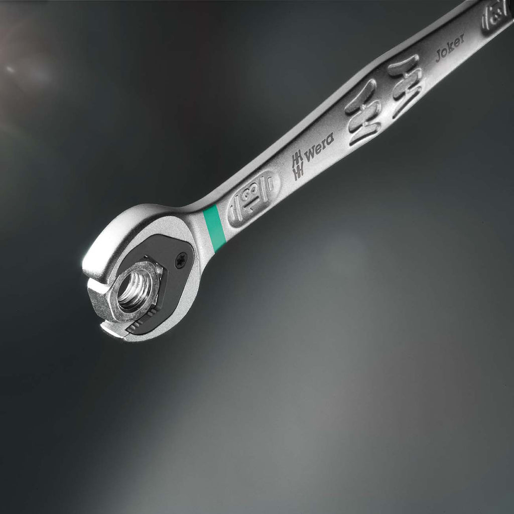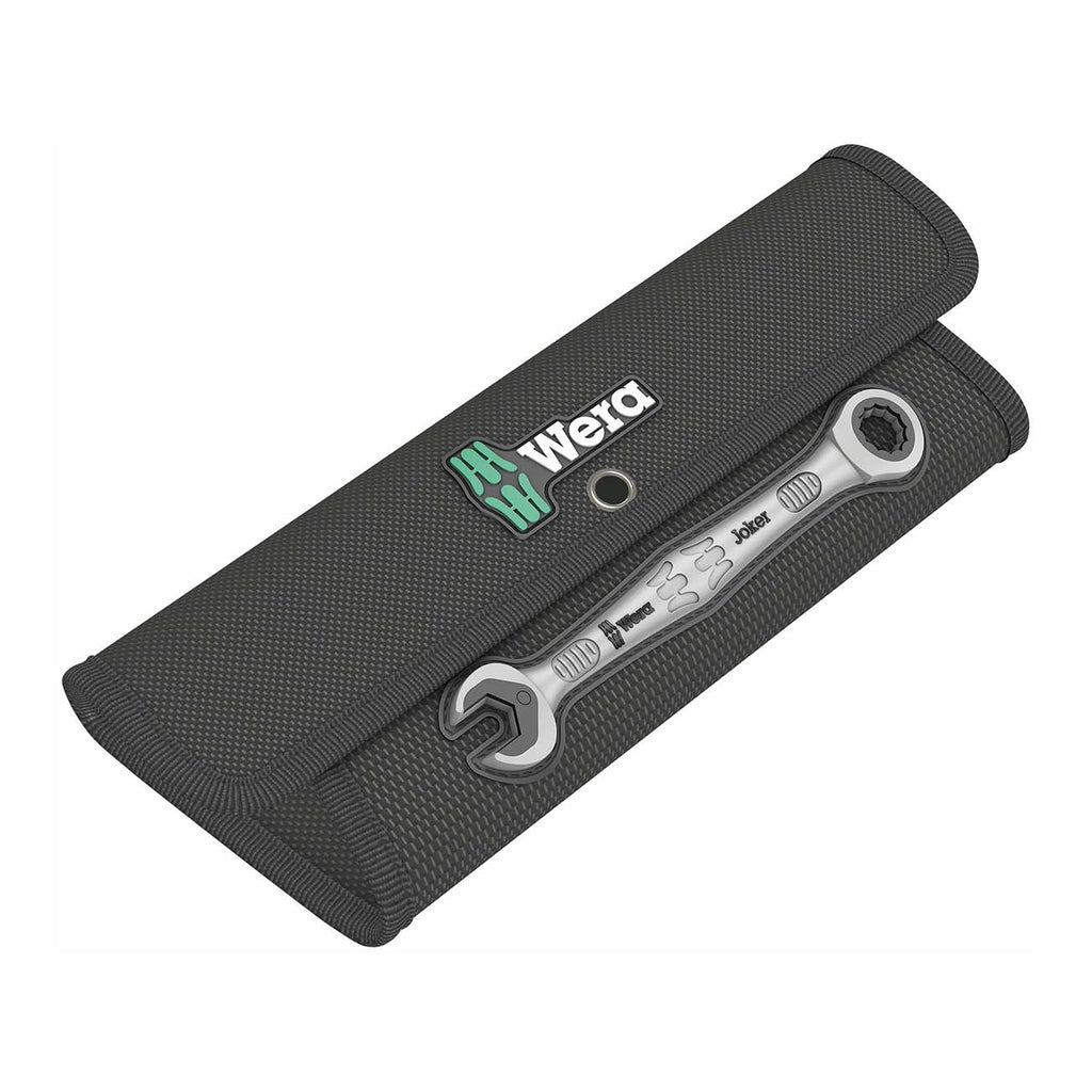 High quality combination ratchet wrench set by Wera: everything that a wrench has to be able to do. And a whole lot more. Faster, better, stylish. Yes, a real Joker. The new generation of combination ratchet wrenches. 8-piece set with Standard sizes in a robust pouch. Suitable for hexagon bolt heads or nuts. Comes with a holding function, thanks to the metal plate in the jaw, which reduces the risk of dropping nuts and bolts. The replaceable metal plate in the jaw secures nuts and bolts with its extra hard teeth and limits the danger of slipping. The integrated limit stop prevents any slipping down around the bolt head and allows higher torque to be applied. The double-hex geometry makes for a positive connection with nuts or bolts and reduces the risk of slipping. A return angle of only 30° at the open end prevents any time consuming flipping of the wrench during fastening jobs. The ratchet mechanism at the ring end, with an exceptional, fine-tooth mechanism – 80 teeth in all – enables flexibility even in very confined working spaces. The specially forged geometry provides for high torque transfer and strength. Manufactured out of high performance chrome molybdenum steel with a nickel-chrome coating for high corrosion protection. "e;Take it easy"e; Tool Finder with color coding according to sizes.