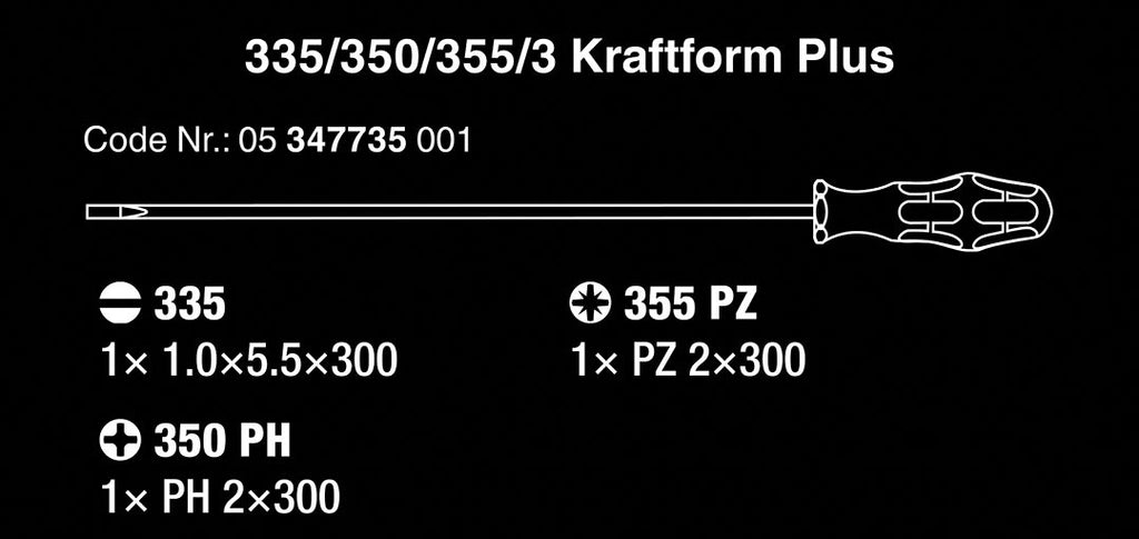 Wera 335/350/355 Kraftform Plus Long Shaft Screwdrivers - 300 mm Long Shafts (3 Piece Set)