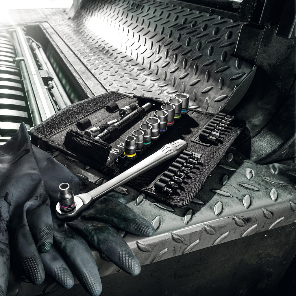Incredibly compact set arrangement with many tools in a minimum of space. A completely new ratchet set feeling thanks to the unique textile boxes that are very robust and durable. They can be positioned upright for tidy storage on the workshop shelf. Additional surface protection due to textile outer material. Low weight and volume for simpler mobility. “Take it easy” Tool Finder with color coding according to sizes.