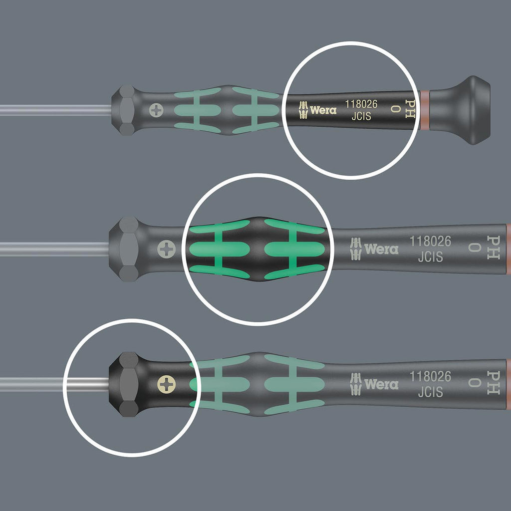 Premium Wera Micro screwdriver for precision mechanical couplings. By supporting the hand on the rotating cap, and due to the fast rotating zone below the rotating cap, lightning fast turning is possible. Time-consuming hand switching is eliminated. The power zone with integrated soft zones ensures the transmission of high tightening and loosening moments. Precision zone for correct rotation angles whilst adjusting. The Wera Black Point tip offers fitting accuracy and optimized corrosion protection. "e;Take it easy"e; tool finder with size stamping and color coding by profile for quick and easy identification of the required tool.