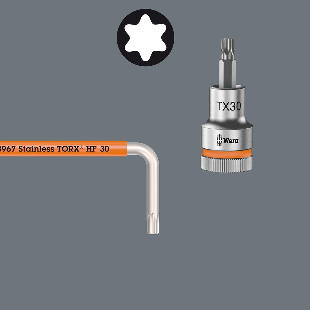 Set of high quality stainless steel L-keys for internal TORX® screws. Very corrosion-resistant due to ice-hardened stainless steel material of the L-key, avoiding the transmission of extraneous rust in stainless steel screw connections. With holding function on the long arm: The clamping force resulting from the surface pressure between the output tip and the screw profile holds the screws securely on the tool. With extra long arm for working in a low position. The grip-friendly hose jacket facilitates screwdriving even at low temperatures. "e;Take it easy"e; tool finder with colour coding by size. With a practical clip made of durable material for secure holding of the L-key while at the same time allowing easy removal.