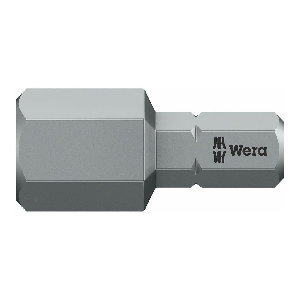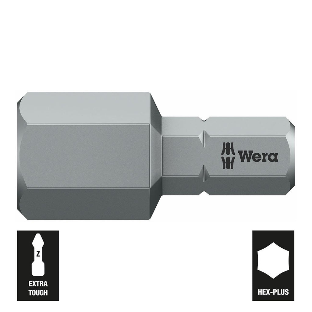 Tough Wera bits for hexagonal socket screws, for universal use. Hex-Plus offers lager contact surfaces in the screw head. The notch effect is reduced to a minimum and the destruction of the screw is nearly eliminated. 1/4"e; hexagonal, suitable for holders as per DIN ISO 1173-D 6.3.