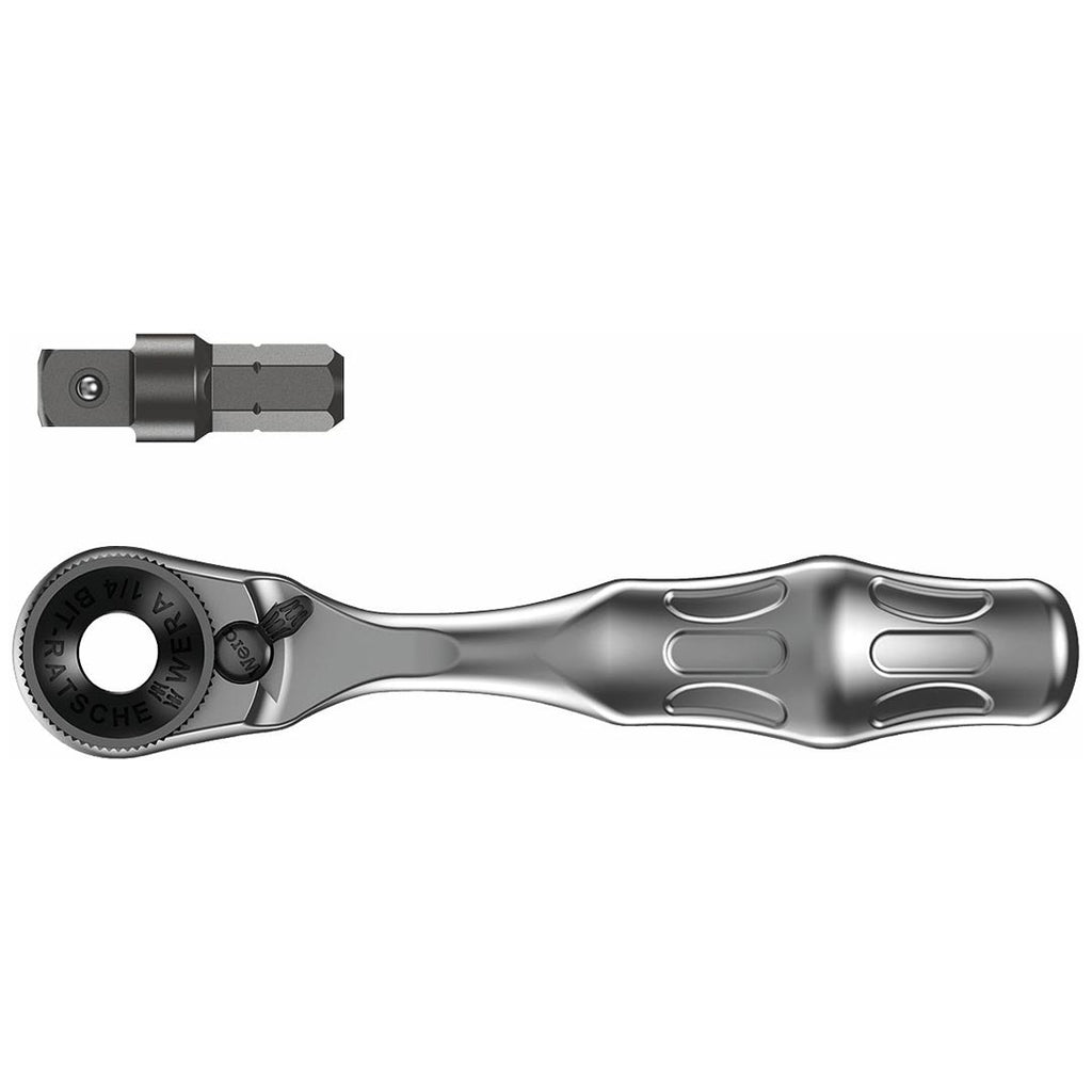 Ratchet, bits and sockets in a minimum of space - as compact as it gets. Simple operation, even with just one hand, in confined working spaces. Drop-forged, full-steel design and fine-pitched mechanism with 60 teeth that allows a small return angle of 6° for precise working. Easy left/right switchover. Ergonomically designed ratchet head and lever. Suitable for ¼"e; bit and socket take-up. The use of ¼"e; sockets is also possible with the Wera adaptor 870/1. Tough viscous bits for universal use. Manual and power tool socket insert (ISO 2725-Part 3) by Wera allows applications both in manual as well as power tools. "e;Take it easy"e; Tool Finder with color coding according to size - for simple and rapid accessing of the required tool. Featuring a good grip to allow easy pick-up even with oily hands. Ball stop groove, for hex head bolts and nuts; chrome vanadium steel, matte chrome-plated.