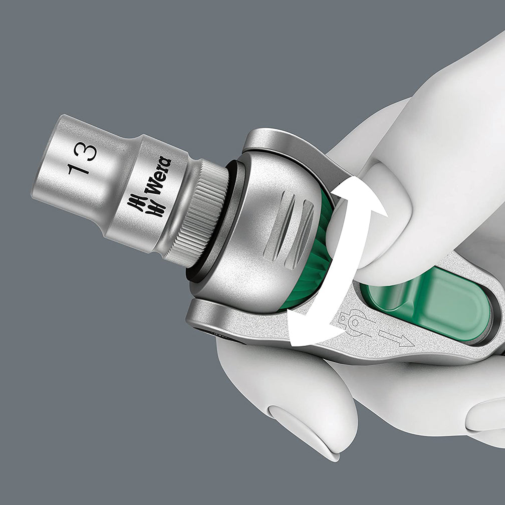 The ratchet head pivots freely and can be locked into any position by using the slide switch that is positioned on either side.