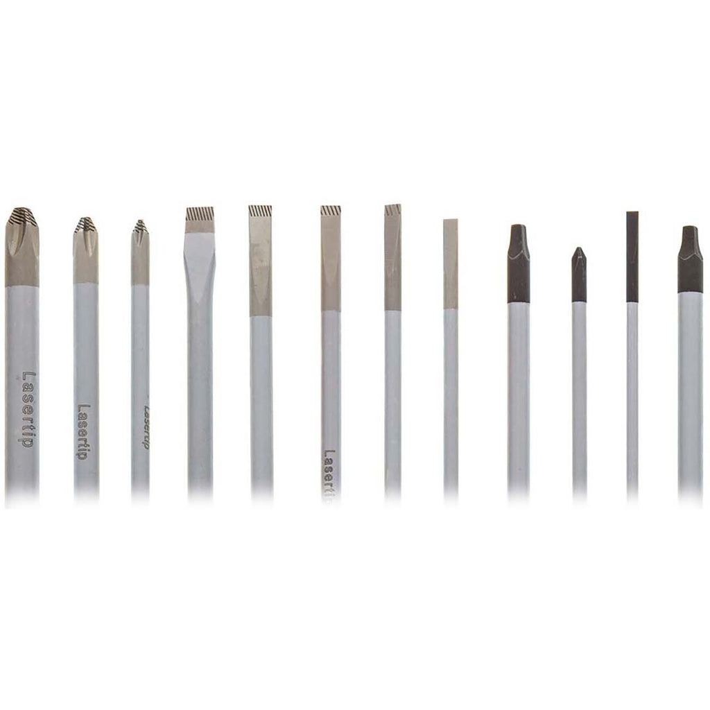 Kraftform multi-component handle, with hard and soft zones, fits the shape to the hand for the ultimate in comfort and high-speed torque transfer Lasertip bites into the screw's head to ensure a perfect fit and reduced slip out (anti cam out) Anti-roll protection at base of handle stops screwdrivers from rolling away at the workplace Handle markings include screw symbol and size of tip to easily find the right screwdriver.